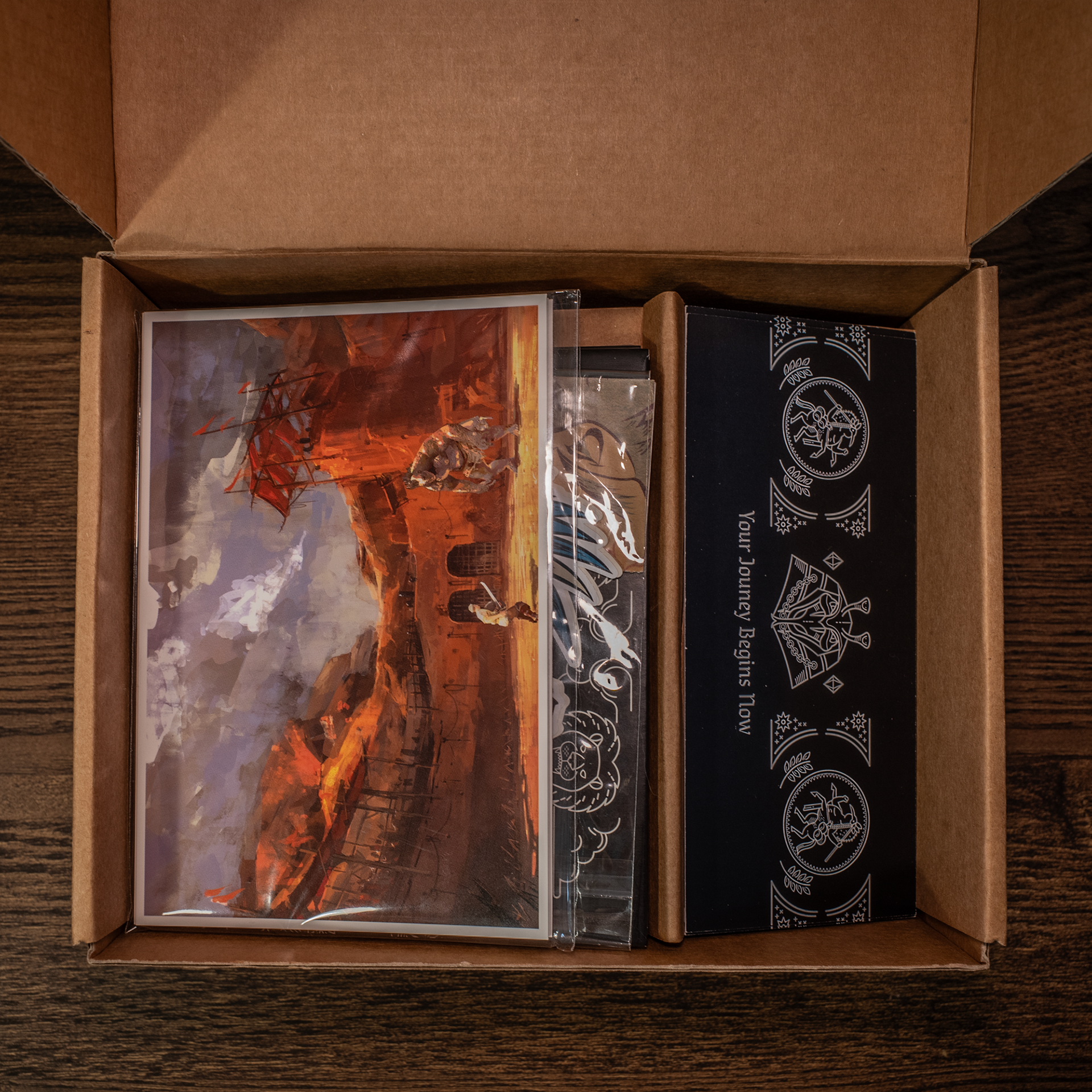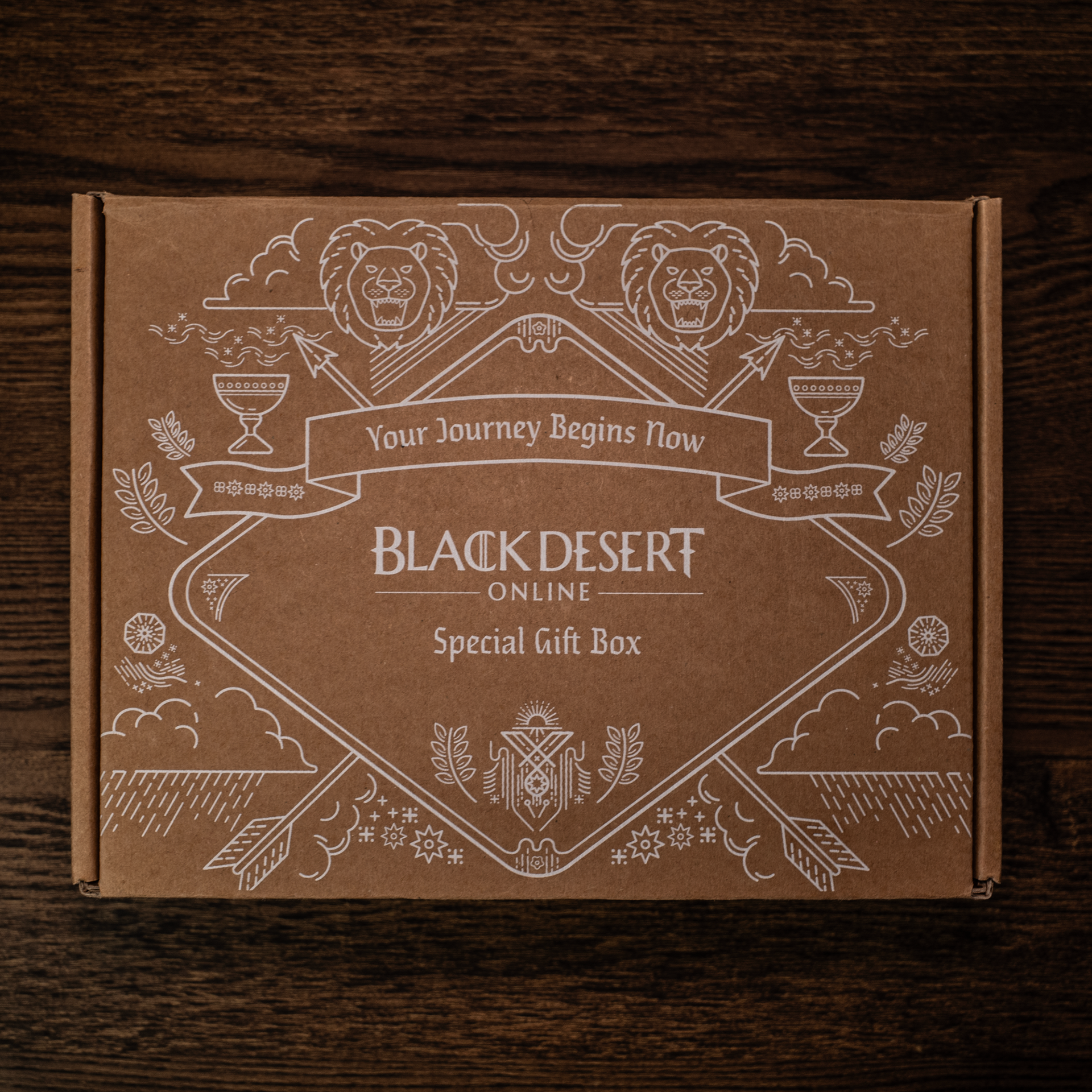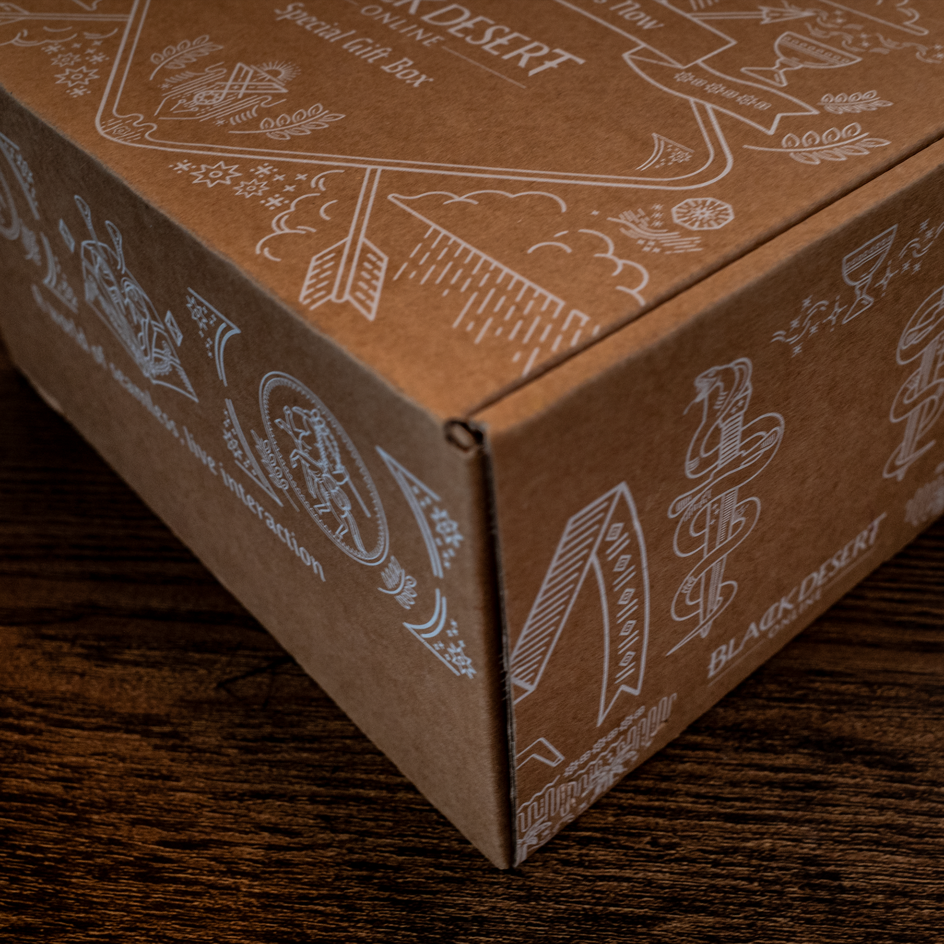 Designed a special edition gift box for Black Desert Online at Gamescom 2016, featuring original illustration patterns and packaging design. Created unique boss monster sticker sets and coordinated all merchandise items — including a potion bottle, soundtrack, T-shirt, stickers, coupons, and postcards — under a cohesive visual theme.